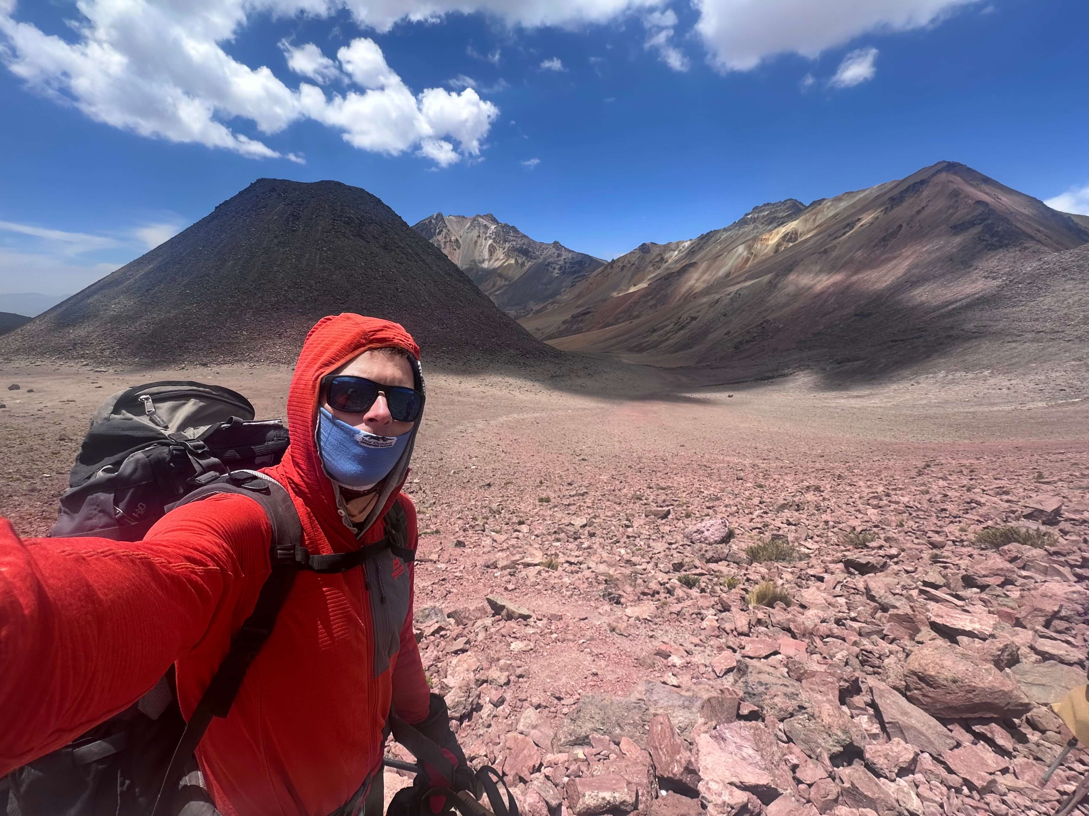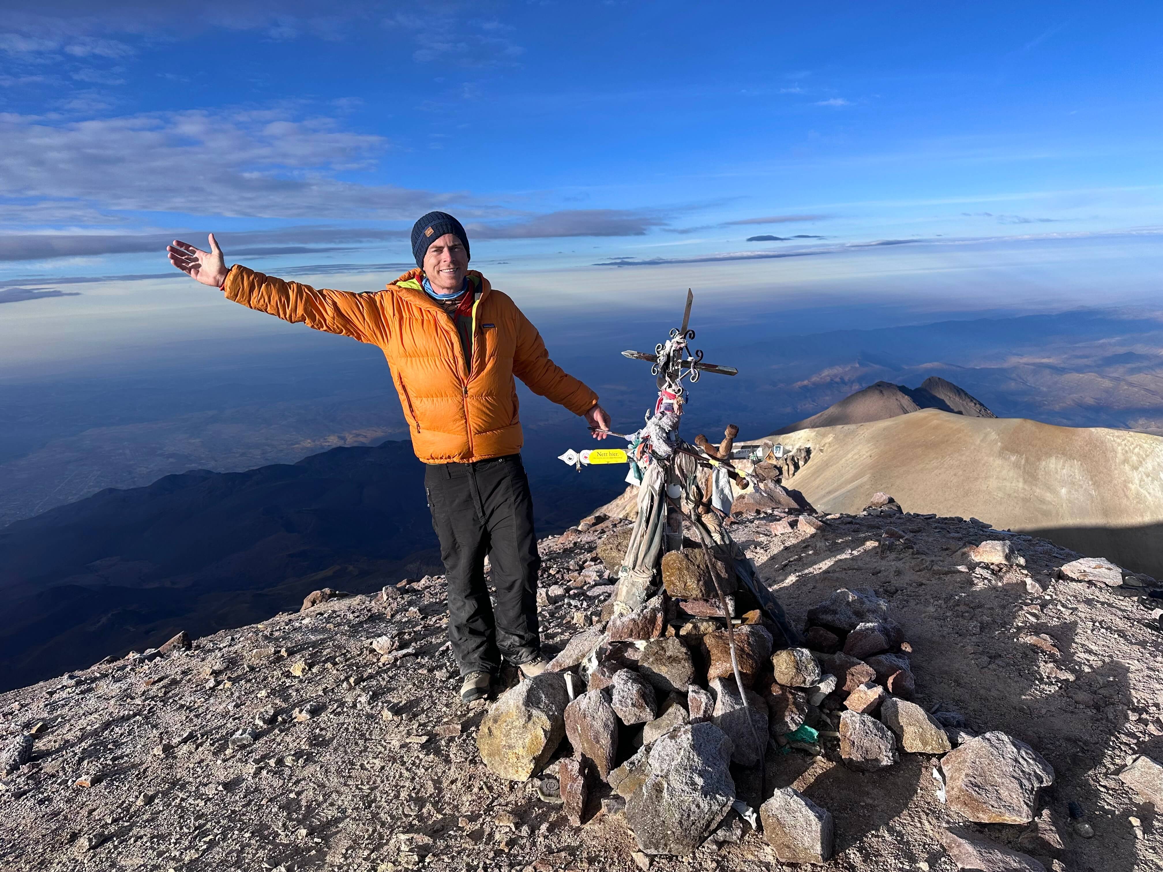 On a lot of high altitude peaks, the guide looks for any reason to turn clients around. Here we had the opposite. Around 5,800m (higher than Elbrus), we passed an Italian couple who had turned back. José spoke to them, and seeing they were fine he convinced them to continue with us. By now, a dramatic sunrise had turned all the peaks red. The final ridge brought incredible views and at 6:00am I reached the summit. The rest of the group followed soon after, joined by the Italians to the surprise and delight of their original group.
