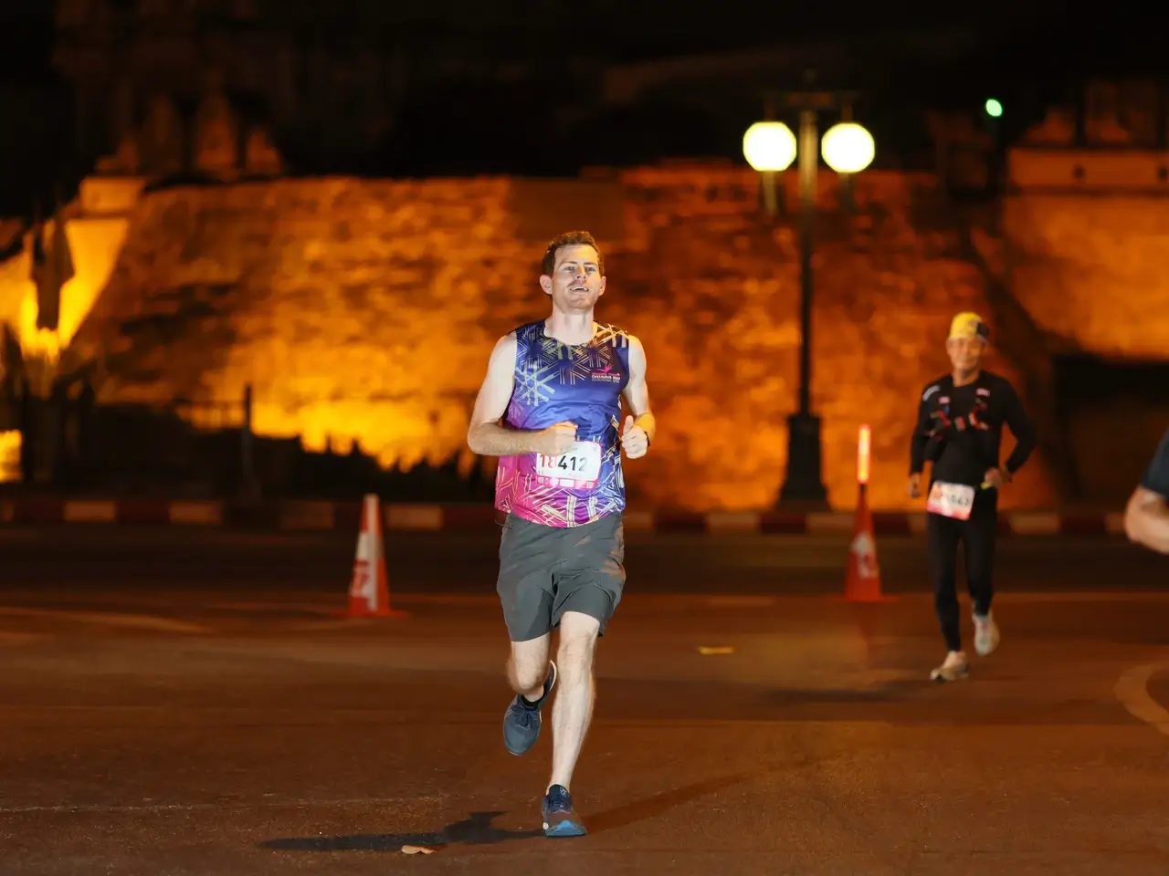 The race starts at 3:00am to avoid the heat and to finish at sunrise. It was humid as I walked to the start, but with a cool breeze I was glad of. The street was lined with flags for each competitor and I quickly found my Irish one. There was a fun atmosphere as they gave a briefing, then a countdown, and sent us off. The race started with a lap of the city walls, where the bridges, towers and moat were all beautifully lit up. It was completely silent as if we had the city all to ourselves.