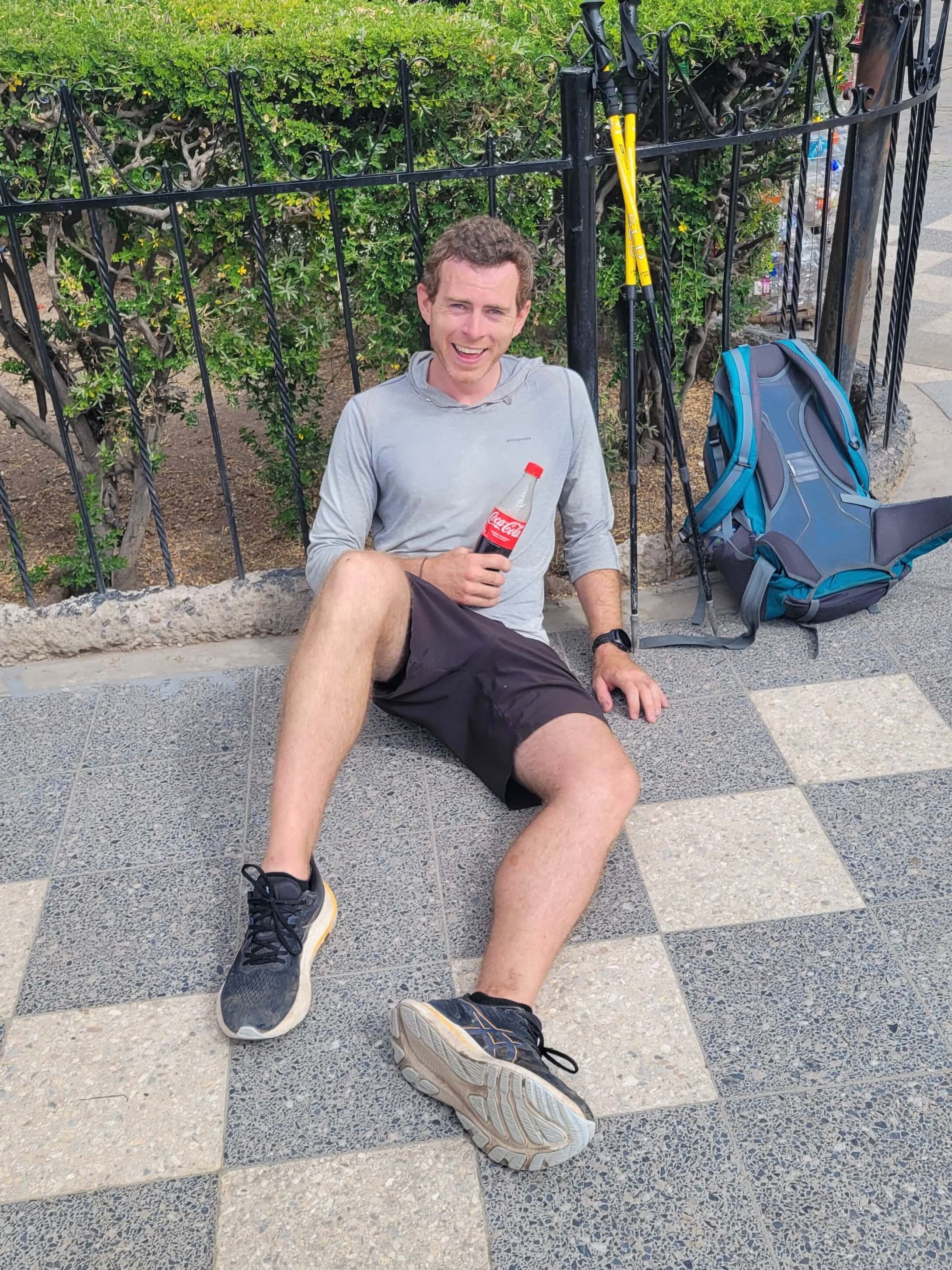 This climb felt never ending, but I loved it. I kept a fast pace all the way, and every time I looked back felt proud. I passed groups coming down, and jogged more and more as it finally levelled out. The top had cool viewpoints, then a final two kilometres of road to the town. I got looks from hikers and people on buses for running, but I knew I was close to my three hour target. Sprinting through the streets, I prayed for the main square to appear, finally seeing Kevin and stopping my watch as I touched the fence where I’d been dropped off yesterday. 2hrs 59mins 47s.