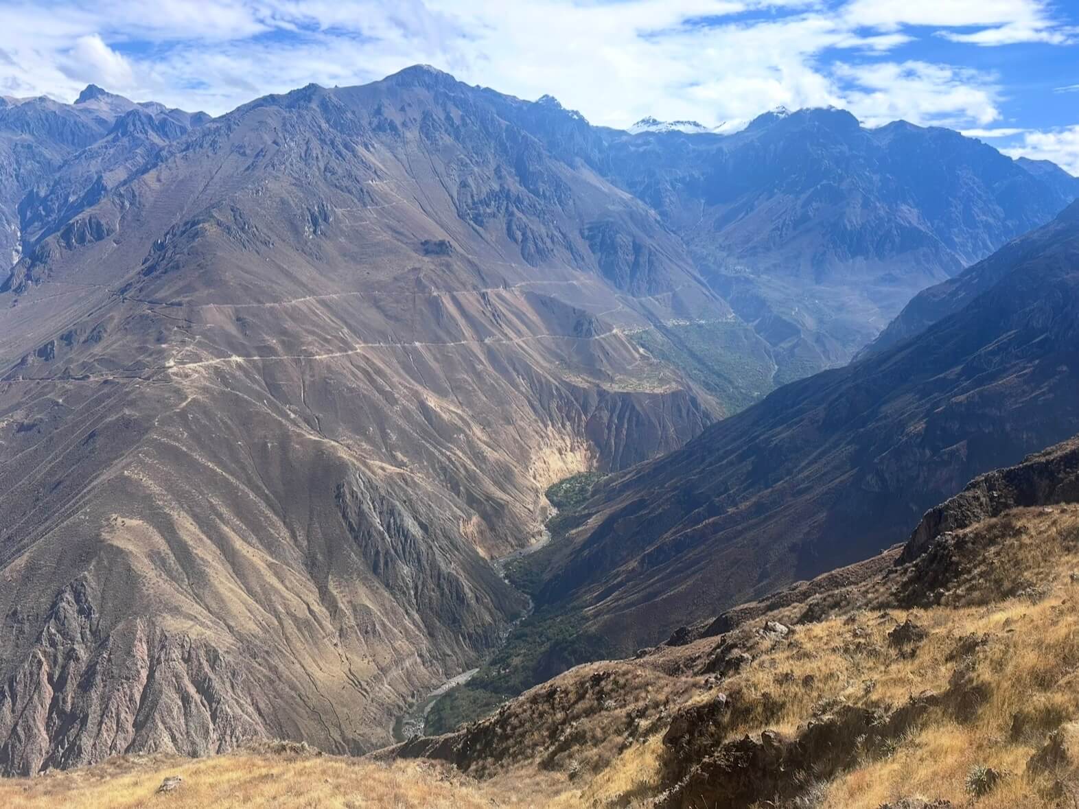2:40am is horribly early, but necessary to start hiking that day. The bus drove high into the mountains on winding roads, stopping for breakfast in a spot that was somehow colder than yesterday’s 6,000m summit. We stopped at viewpoints to watch Andean Condors circling above, and to peer deep into the canyon. Finally we reached colourful Cabanaconde at 8:30am. I jogged to the west loop trailhead, not knowing how long of a day this would be. I signed a book at the entrance, and off I went.