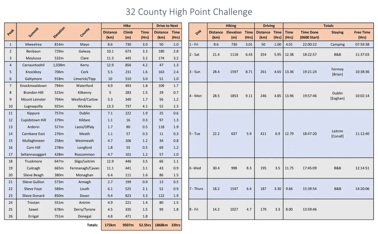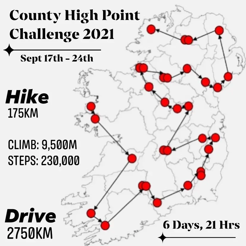 In September 2021 and joined by Eoghan Calnan, I achieved my goal of hiking the highest peak in every Irish county, all within one week. This is an account of that adventure.