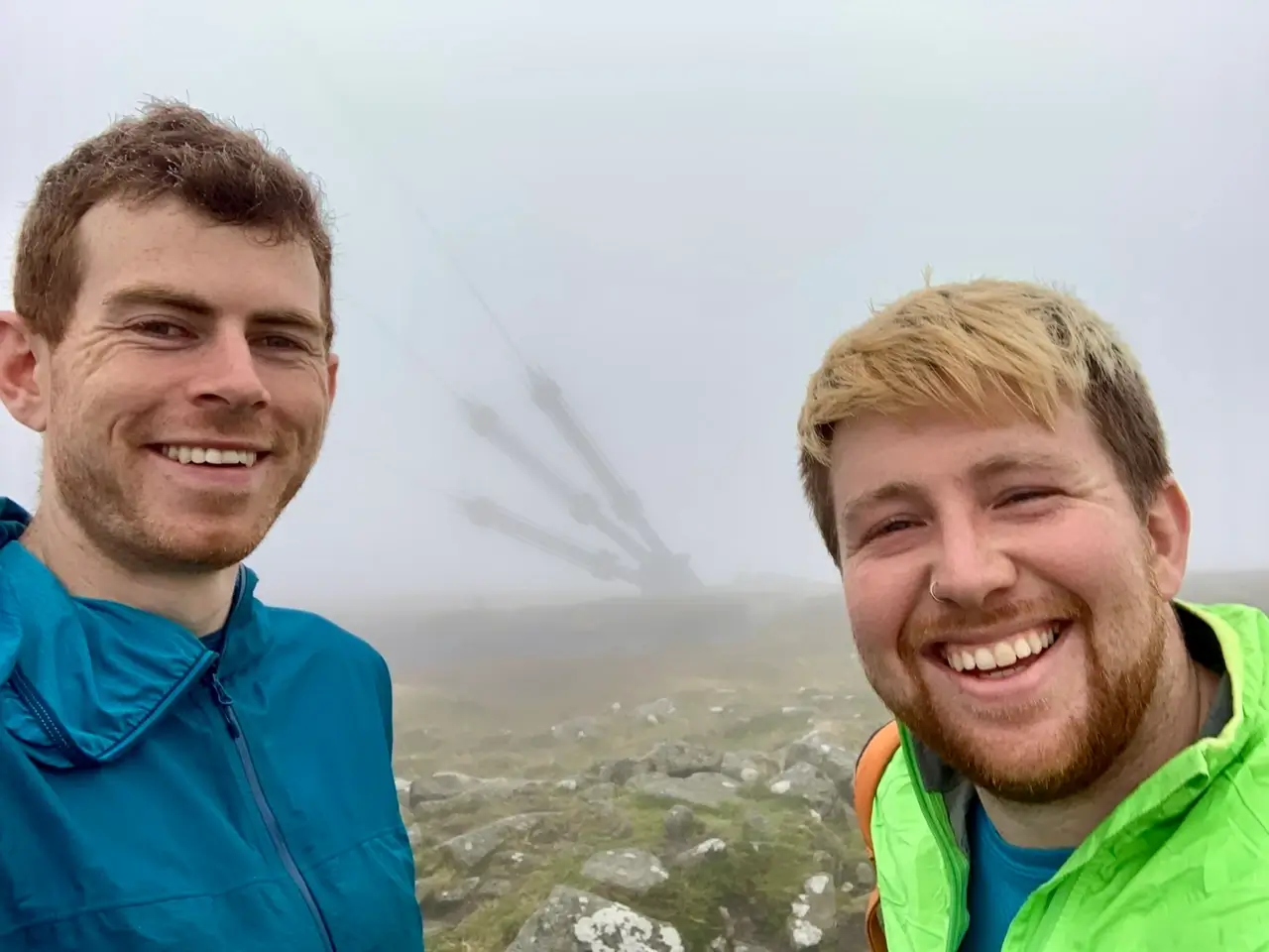 One of the hills with an RTÉ mast on top, so not a hike, just a walk up a steep access road. Plenty of others walking this one too, who were very interested by our walking poles and hiking clothes. They couldn’t believe our plan for that day alone. Reaching the summit at 3:00pm the dense fog made the barely visible mast look very ominous.