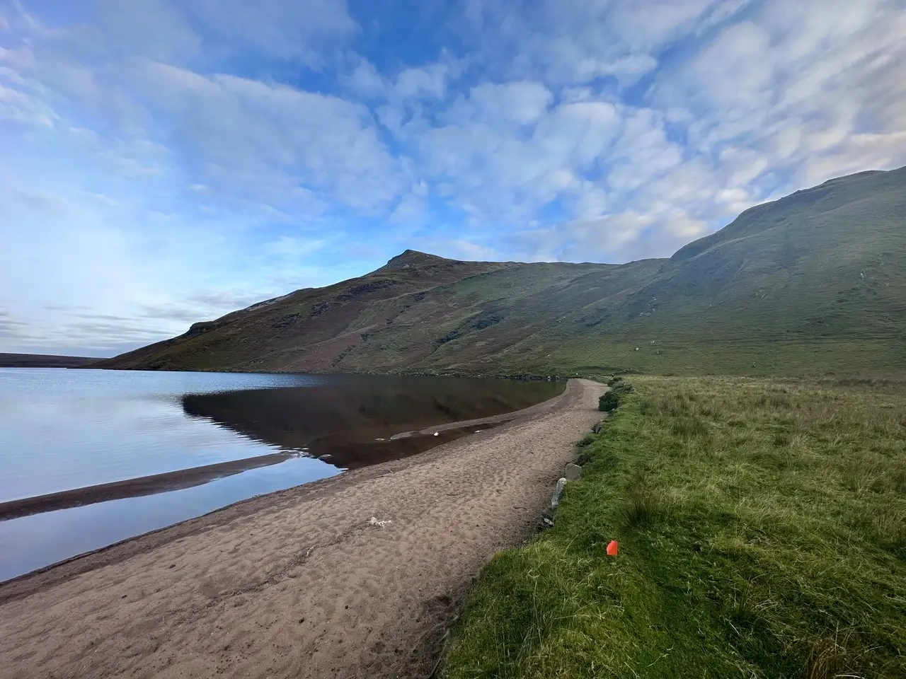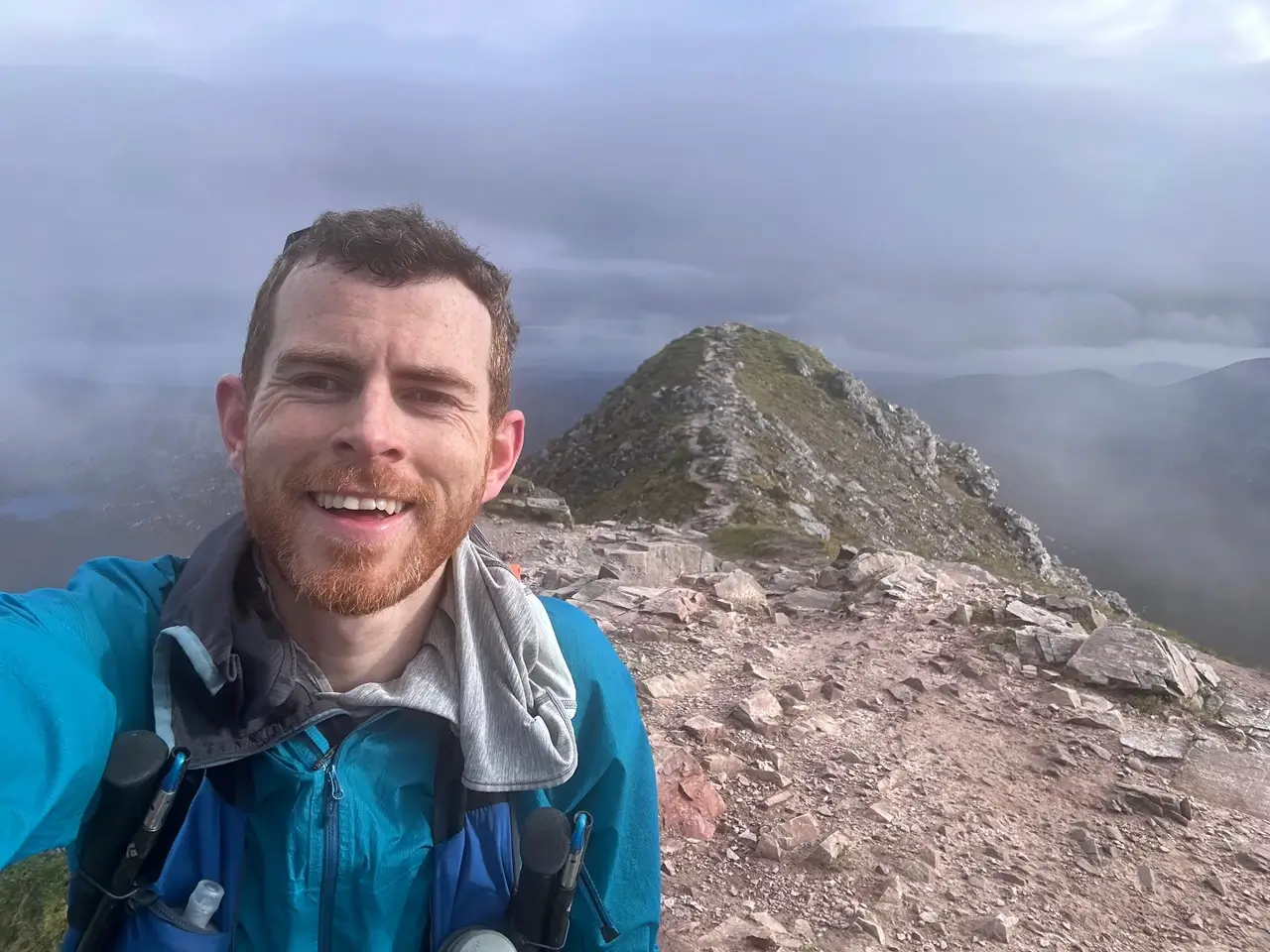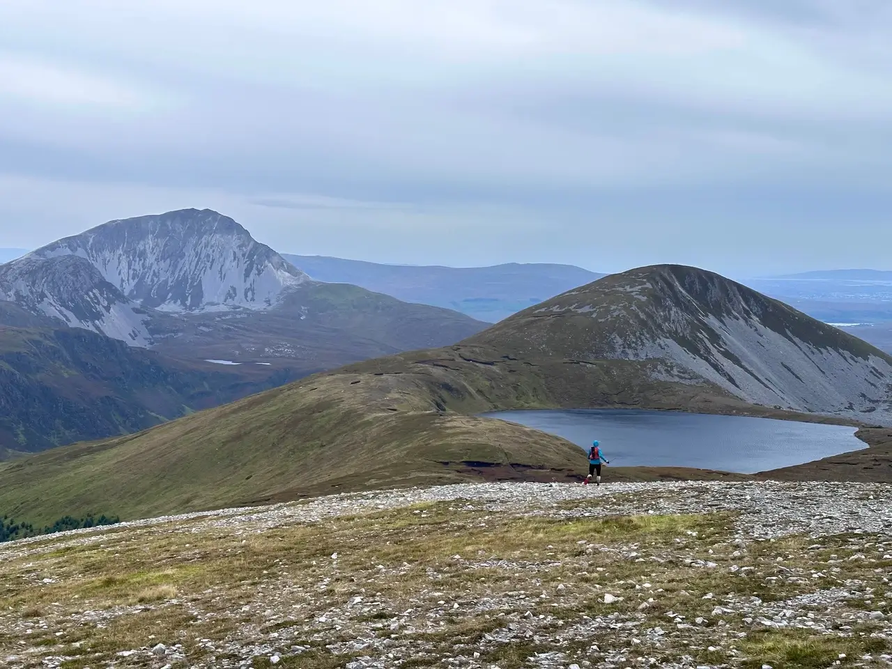 The first few hours of the return were almost enjoyable. There’s something nice about seeing a peak for the last time, and I was able to zone out by chatting with people around me. The big issue was the steadily growing wind which was well above 50km/hr as I ran the central ridge. On exposed sections I could barely stand, and I stared at Errigal wondering if we’d even be allowed up there. Hours later I was waving goodbye to the lake and boggy sections as I climbed the second last peak. On the descent I saw the point where we turn for Errigal, and a marshall was still allowing us to do so. I found out after that they closed that option only ten minutes later.