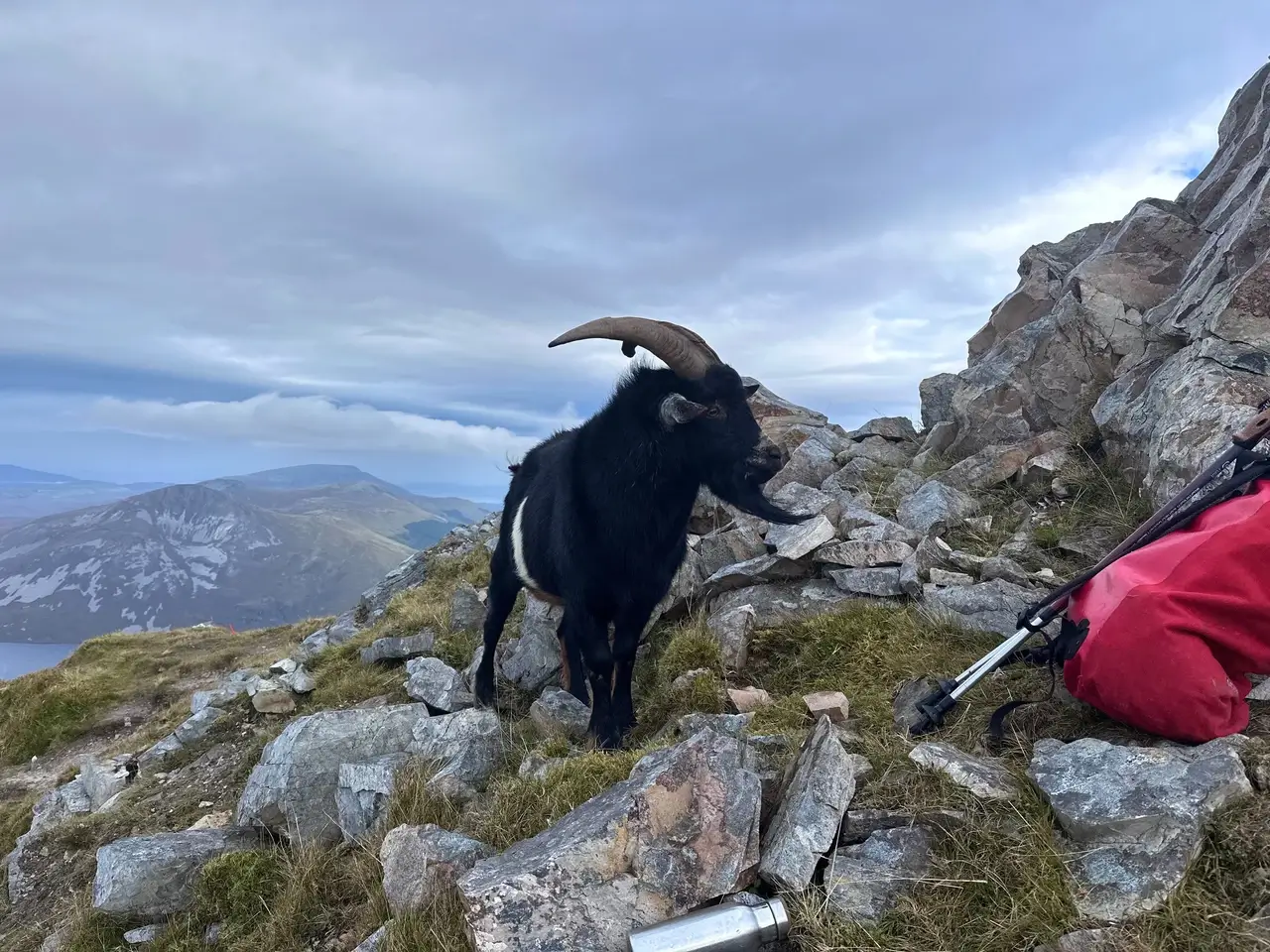 I was 10 hours into the race when I took that turn, and got very emotional to know I could finish the full route. I ran the sweeping trail to the other side of Errigal for a scramble up the back, after which we’d descend the normal route on the front. It was genuinely dodgy, with gusts that could easily blow you off the cliffs, but still not the worst conditions I’ve experienced up there. I passed some very nervous people as I followed my system of running between gusts, and hunkering down for the bad ones. Approaching the top I passed a mountain goat and climbed through the iconic rock arch.