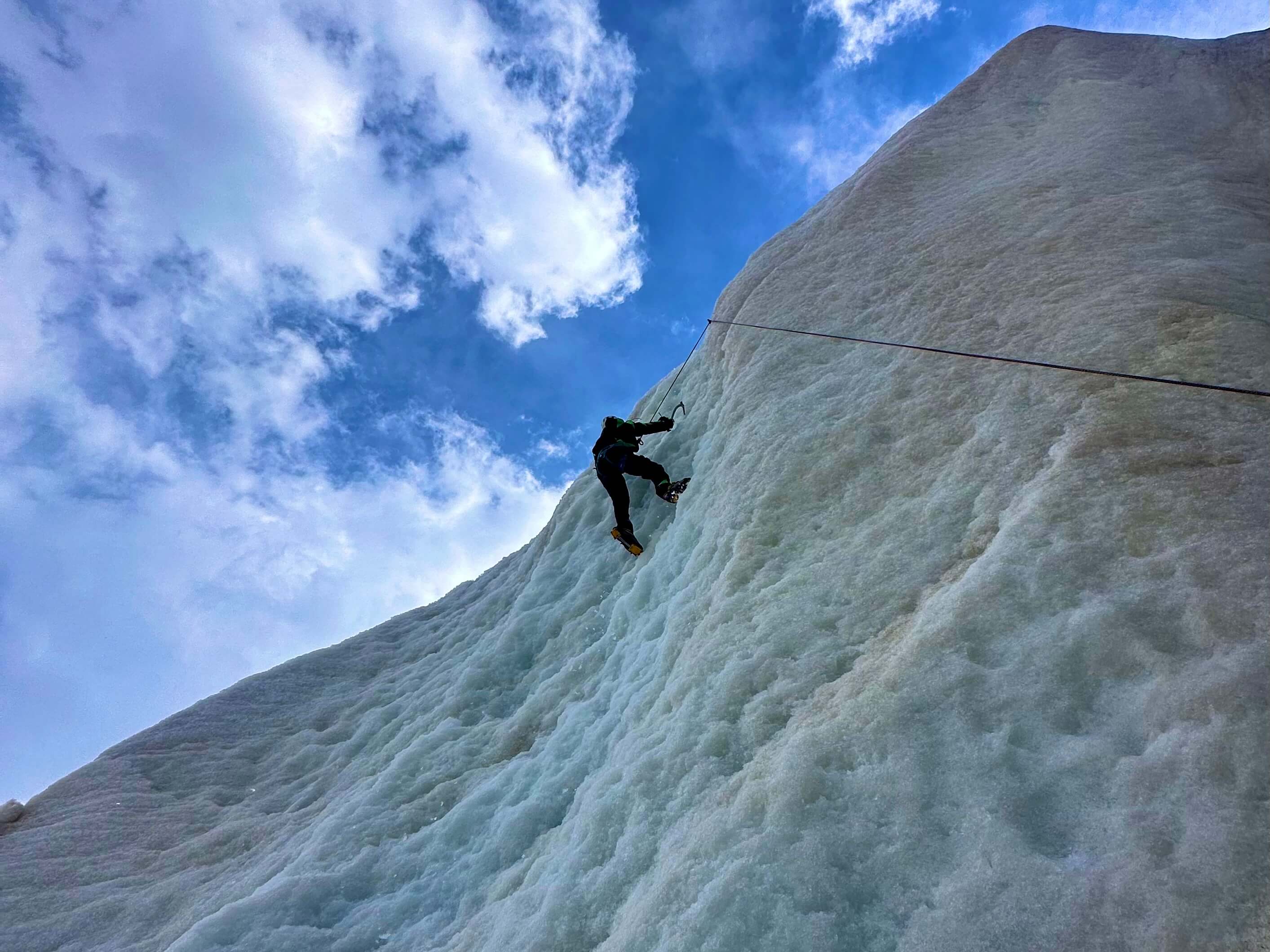 Once everyone was moving comfortably, we walked up to a vertical wall of ice at the head of the valley. Here we were shown how to ice climb using stubby axes, which is far harder than it looks. We got the iconic photos on the wall that the mountain is known for, then with arms burning walked back to base camp. Over a big dinner and a night of card games we were all in high spirits for what was to come.