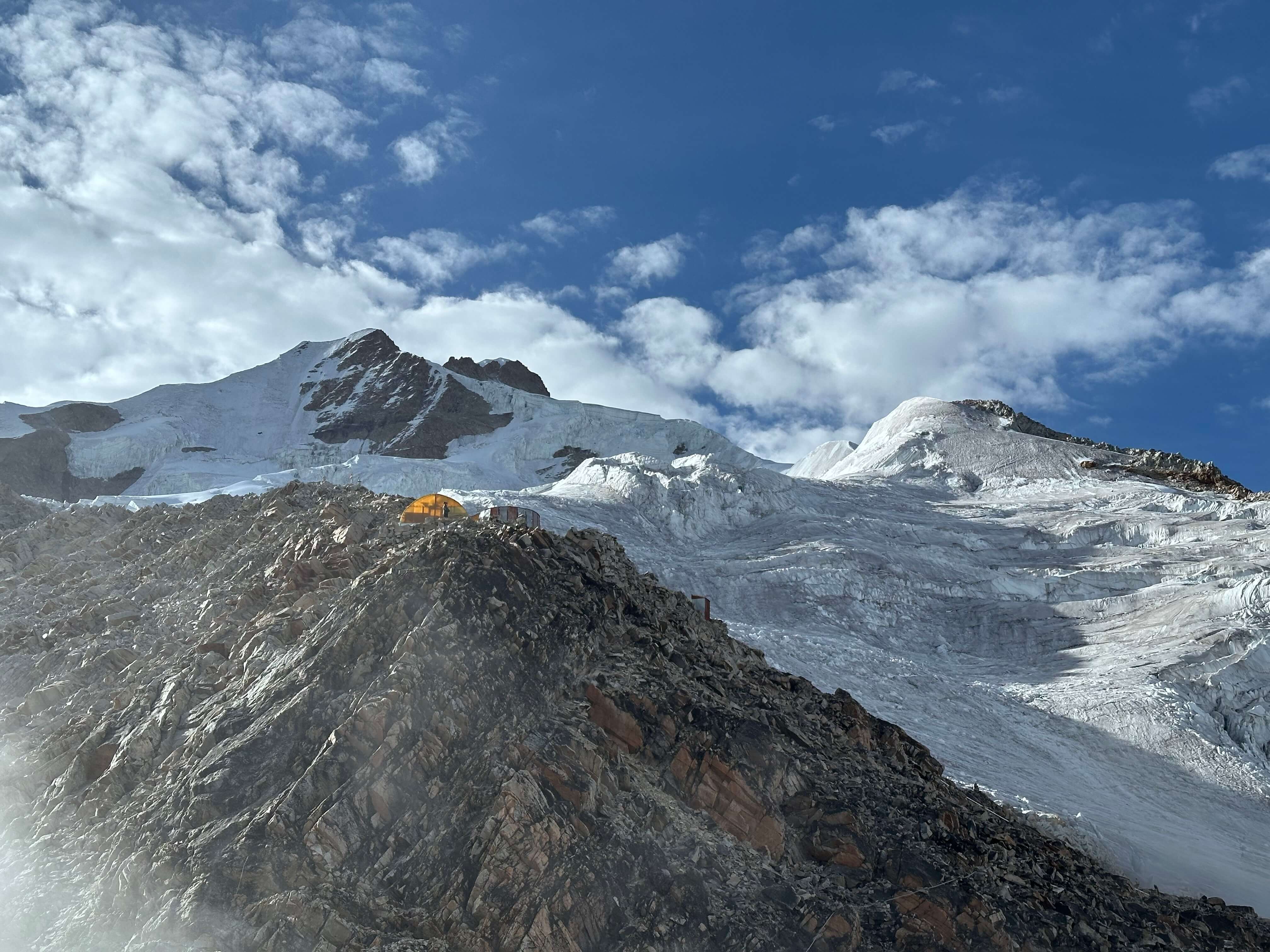Today was intentionally slow. We ate loads, while breathing in the thin air and looking up at the remarkably clear summit. We met teams going up, and others just arriving. Shortly after lunch we started the 2 hour walk to high camp. This was mostly big rocky steps, with small sections of snow and scrambling. The bags felt heavy, but at a slow pace was fine.