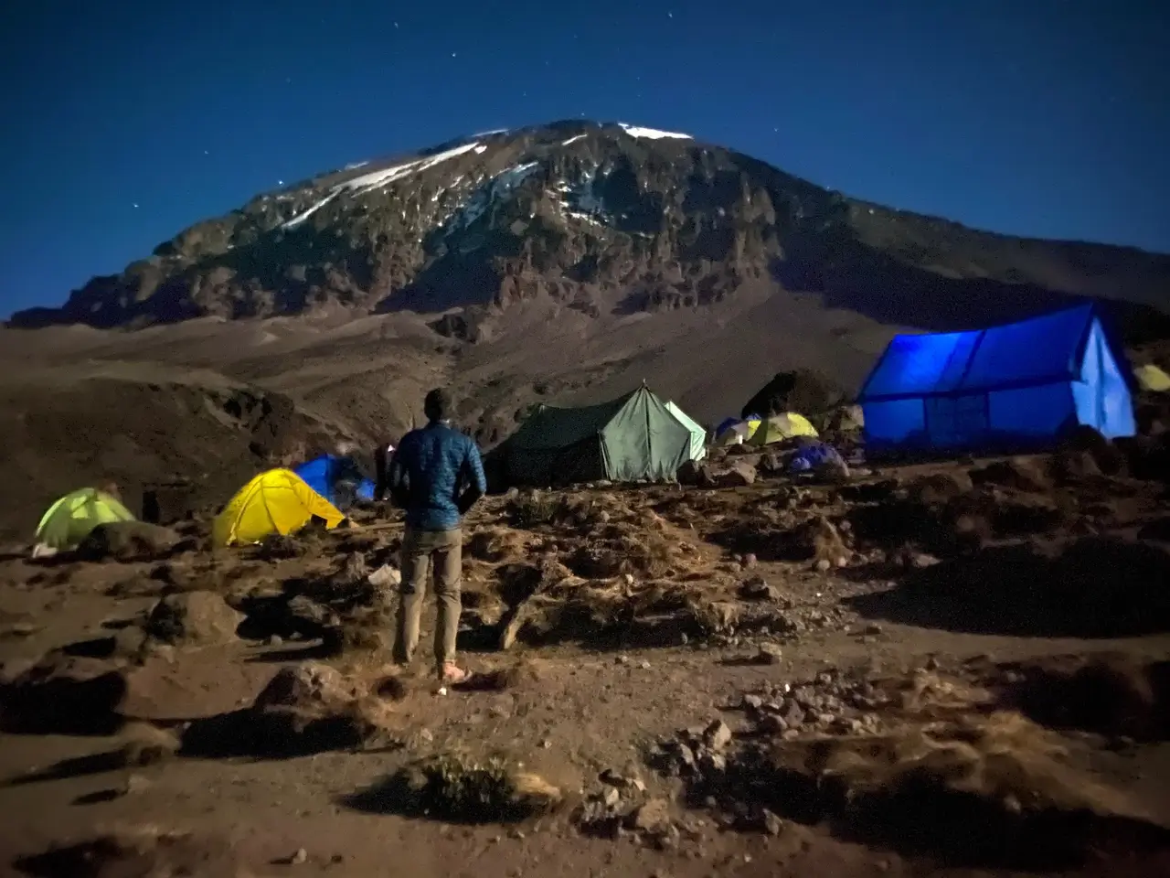 There was a nice sunset over the summit which most campers watched. Ally and Abou checked in on us and went over the plan for tomorrow as they would every night. Ally was instantly like a father; easy going and humble, yet nothing feels left to chance. He’s quietly aware of how much you’re eating and drinking, he chooses the food and adds extra salt from experience, and even the warm water for hand washing is just a clever way to avoid illness. We slept well that night.