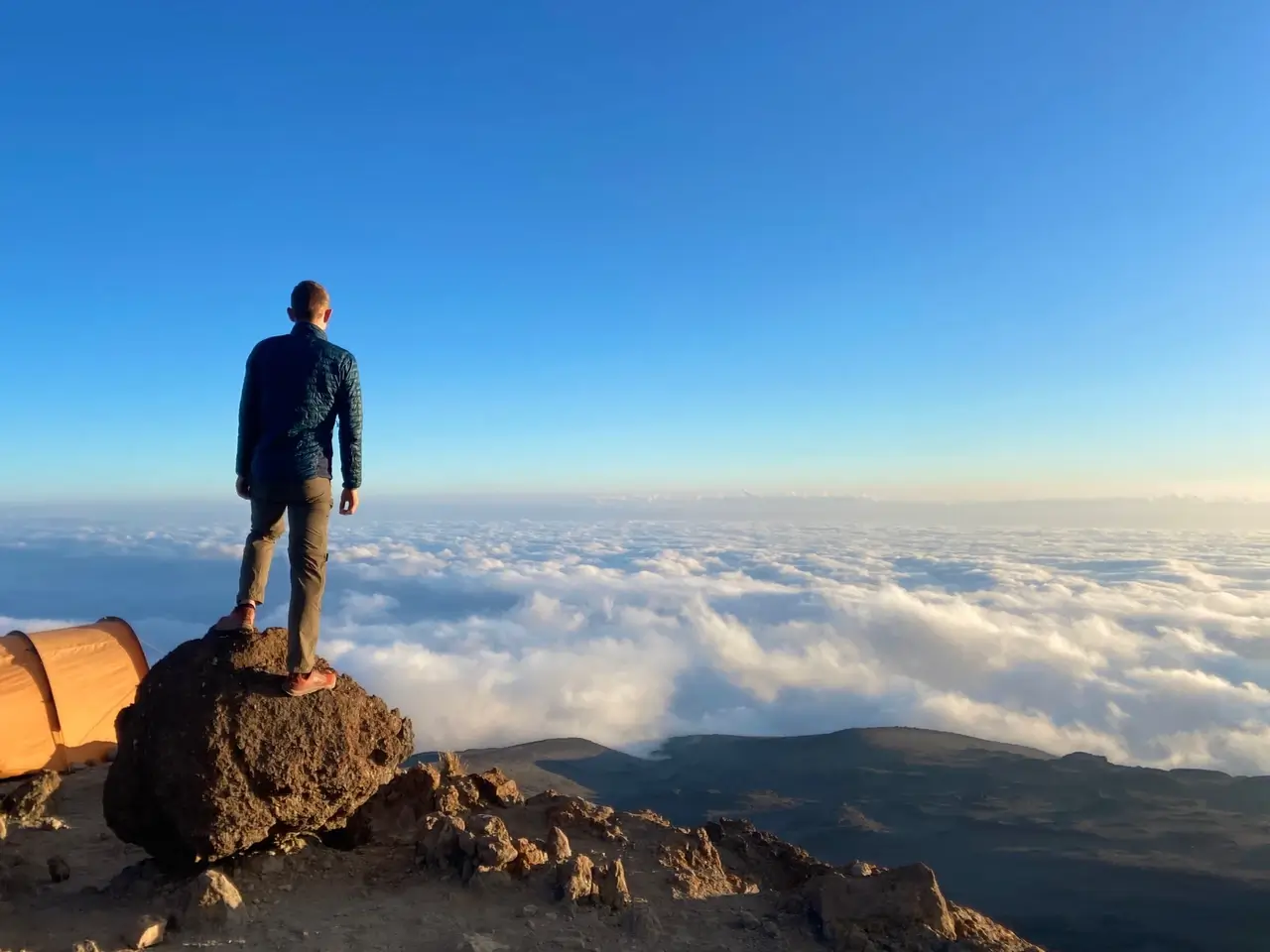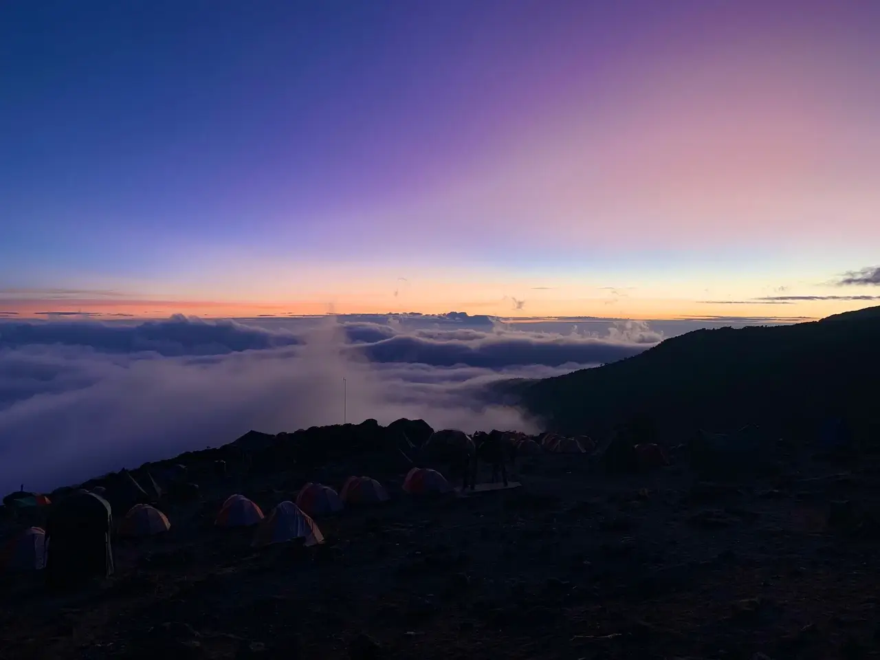 We got in our usual 4 Liters of water early and slept most of the day. Dinner was a hearty stew with a big dessert, after which we sat at the cliff edge watching the view. All fog had lifted and Ally said it would be cold but perfect conditions. The clouds below were an ocean, with only Meru poking through (a 4,566m volcano, 70km away). We stayed up until sunset, sitting with hot chocolate as the summit lit up in all the colours, and then went dark. The porters wished us luck and with that it was time for bed. We didn’t sleep very well but Ally said even the guides rarely do up here.