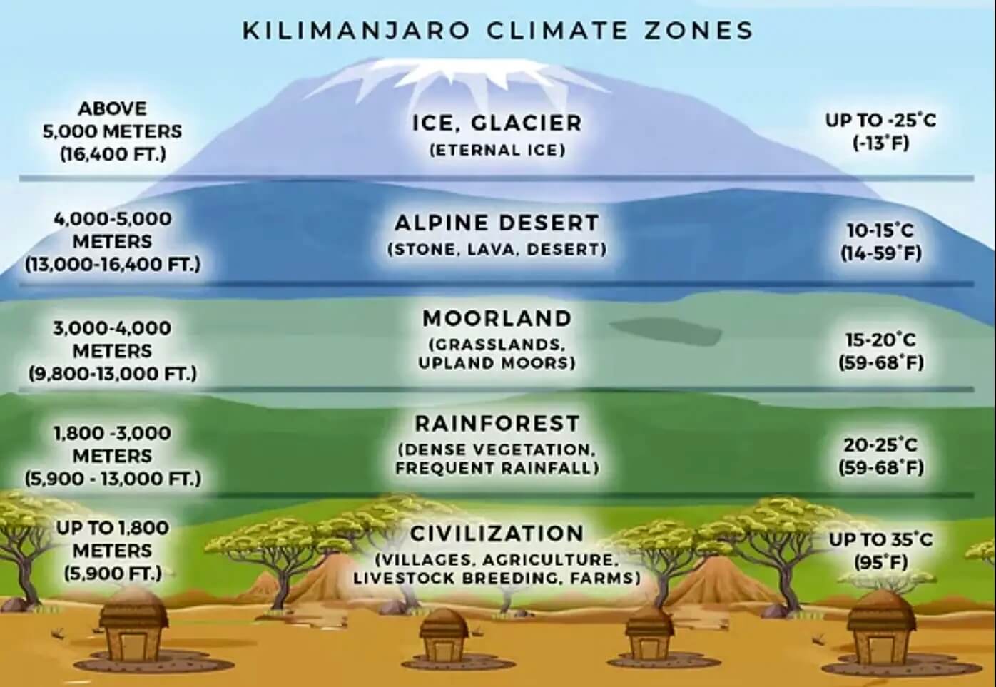 Kilimanjaro has five ecological climate zones. The Arctic Summit (Ice Cap) has seasonal snow, year round glaciers and is devoid of almost all life. The Alpine Desert is slightly less inhospitable, but mostly sand and rugged rock formations. The Moorland has hardy shrubs, grasses and heathers, sometimes compared to the Scottish Highlands. The Rainforest surrounds the mountain with a dense and damp home to all sorts of plants and animals. Then finally the surrounding area benefits from rain and rich volcanic soil to form the Civilisation or Cultivation Zone; full of human life and arable farmland.