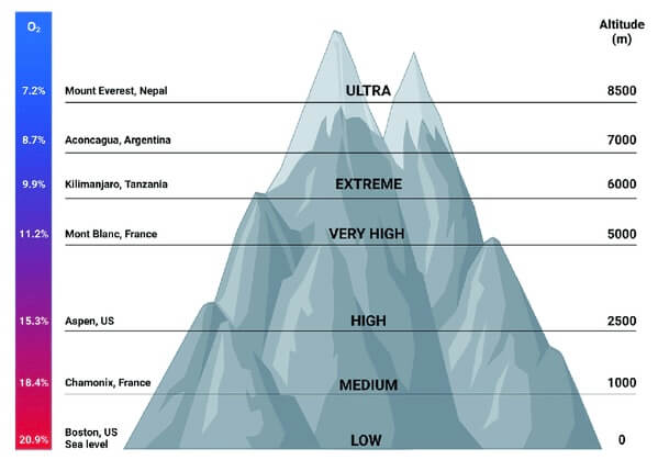 Air is less dense or thinner at altitude. Oxygen molecules are more spread out resulting in each breath containing less of them. Our bodies must adapt to extract more than normal. This is what’s known as acclimatisation. Breathing and heart rates naturally increase, allowing more air in and more oxygen to be transferred from the lungs to our blood. The body also ramps up the production of red blood cells, which are our oxygen carriers.
