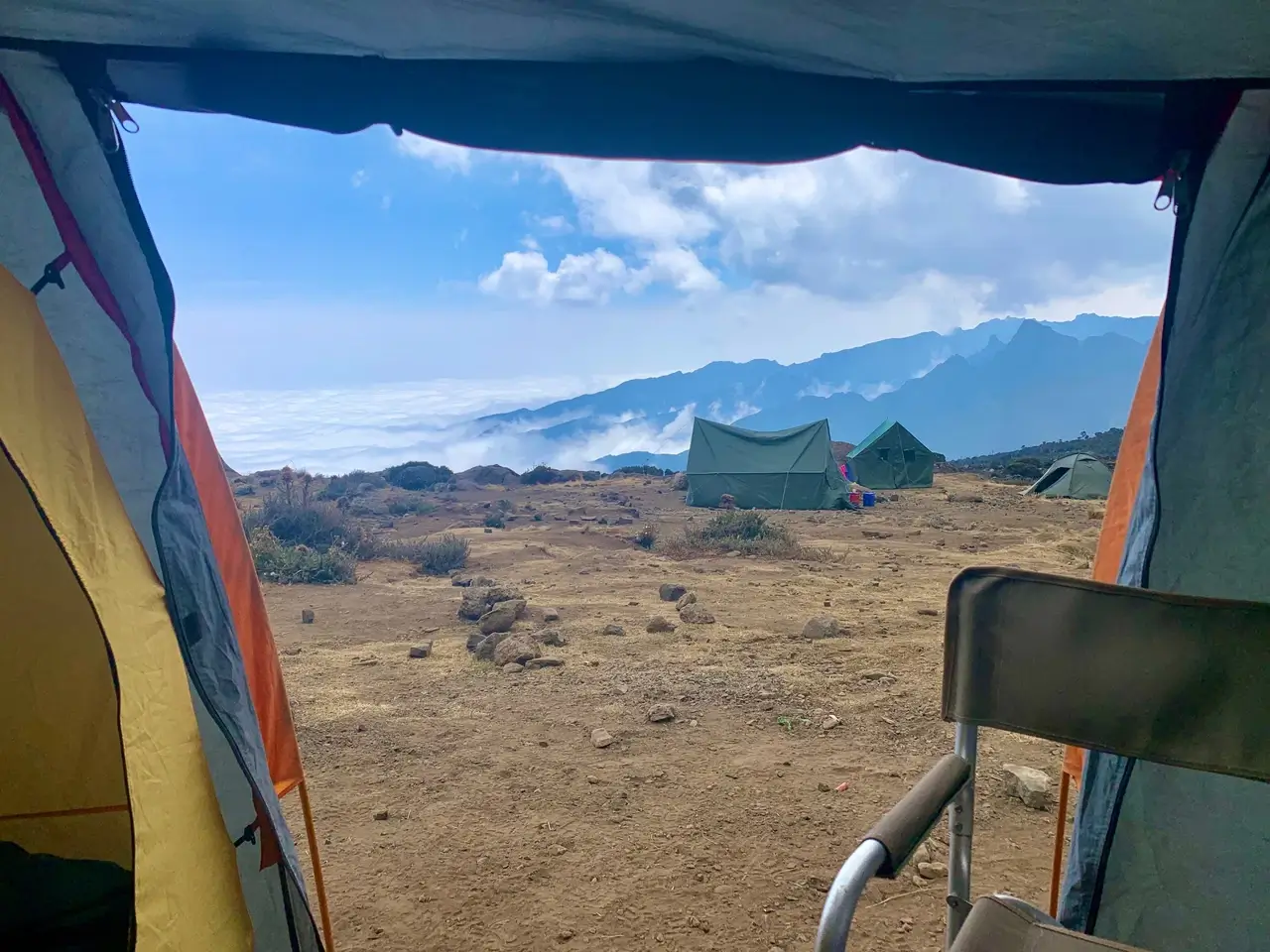 That night Ally took us for an acclimatisation walk which is surprisingly hard to both get up for and to do. We saw Shira Cave and reached a viewpoint that looked out on the busy campsite. We discussed the plan for tomorrow, giving some time for the body to accept the elevation change, then descended back to have dinner including fresh donuts for dessert. Groups near us sang Jambo Bwana which is the favourite song of all porters. I looked down at the sea of clouds during sunset, amazed by how quickly it seemed to flow. We both slept well again, feeling strong but far more tired than we had anticipated.