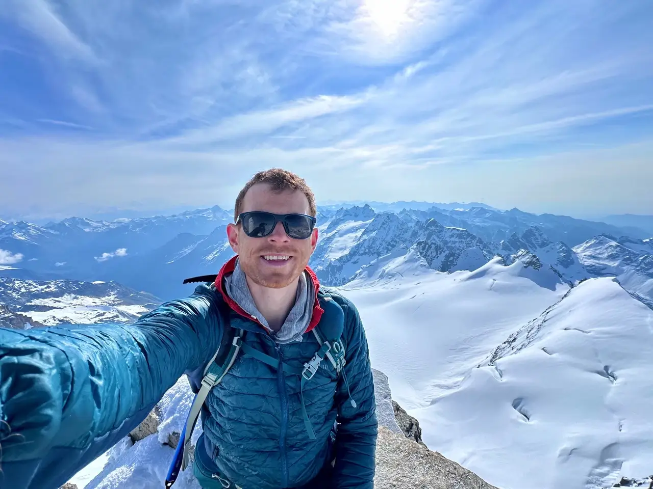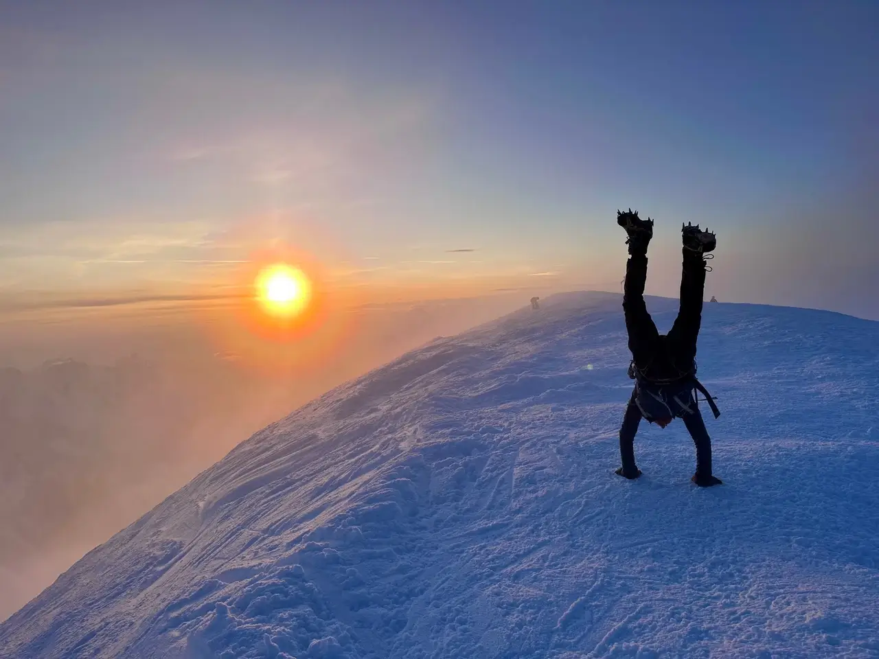 A sharp, snowy ridge meandered up from here. It had constant false peaks as we skirted around ice walls, crevasses and cliffs. Painfully steep, then easing to reveal yet another peak ahead. The sun began to rise on the Italian side revealing the extent of the views. Looking behind was surreal but I kept plodding along and focussed on my breathing. Niall was feeling the altitude and the cold so we kept moving. It actually confused me just how many false summits there were, to the point that I didn’t expect the final one to be the real summit either, but suddenly at 6:00am it levelled off.