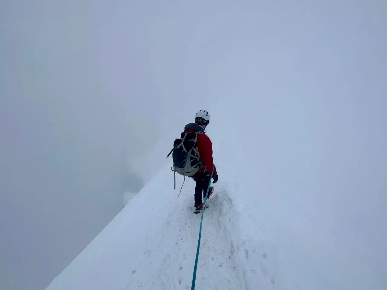 We had no visibility on top, but it was still cool. Tourists walk between view points and information signs in the station, but everyone with mountaineering equipment heads for the same carved ice tunnel. We needed all our gear and a short rope on before exiting into the blinding light of a steep, snowy arête (a sharp ridge caused by glacial erosion). I kept tension on Niall’s rope as we slowly descended down into the mountain range. It genuinely amazed me how that tunnel seemed to teleport you from civilisation to wilderness.