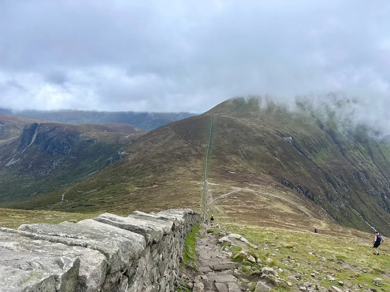 From here I followed the Mourne Wall for a fast descent to the usual saddle, coming against everyone who hadn’t crossed the river. Then a steep climb up the other side to the second peak; Slieve Commedagh (765m). The summit was high in a cloud, making it hard to tell how far was left. After a tough effort against strong wind, I turned to go back down to the saddle. On the way I noticed others climbing over the wall to take a more steep and direct route once again. I was getting the idea now and followed.