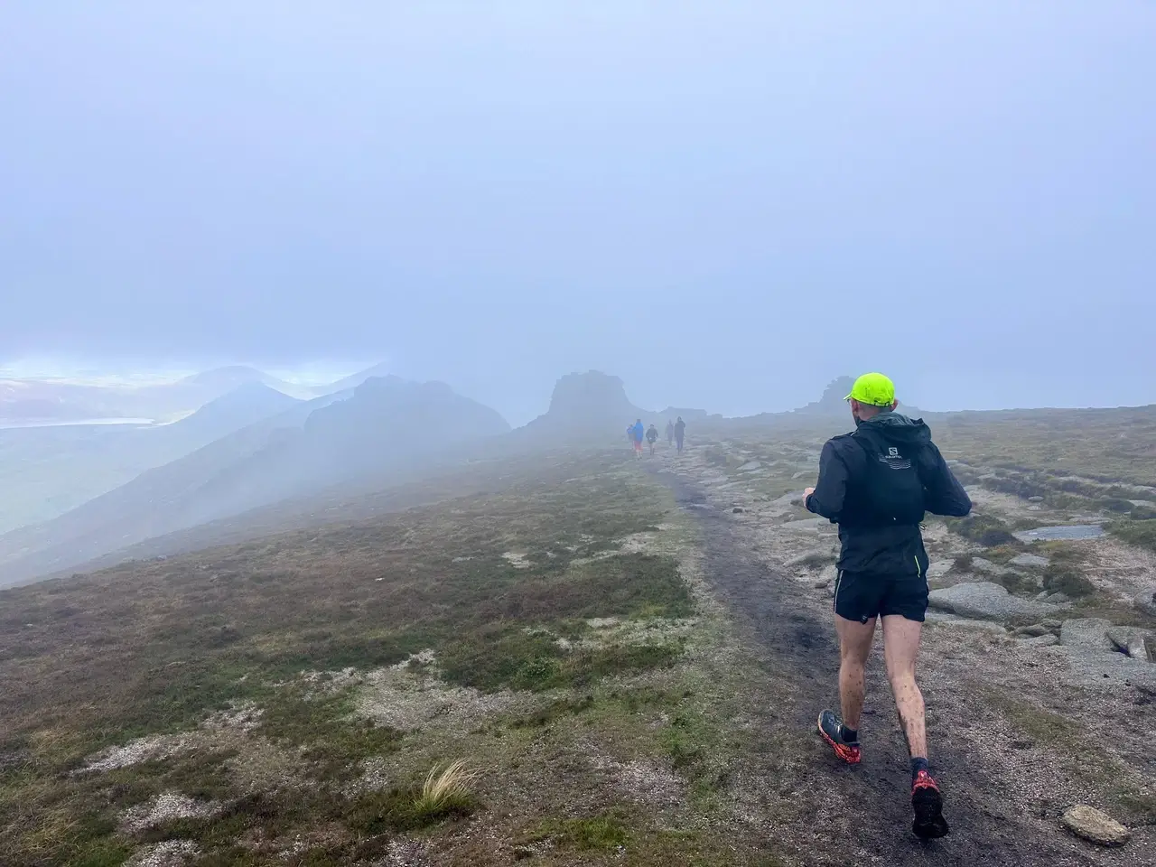 Ahead of us was the south west ridge, which looked foggier and stormier than everything before. I was worried about my knee so I took it slow on the climb up, only running for brief periods to reach the far end and our fourth peak; Slieve Binnian (747m). This marked the halfway point.
