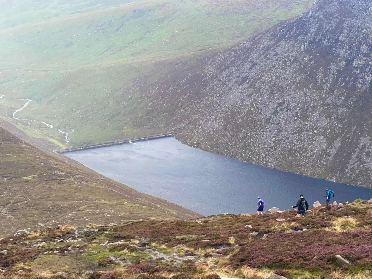 It was definitely direct, I’ll give them that. Very wet, and at times a climb with your hands, but clearly faster. The steepness had everyone huffing and puffing, but less distance and more gradient suits me. Towards the top it levelled off, allowing me to appreciate the view back to the town and the ocean beyond. The heat was already intense, but wind and cloud cover on the summit provided relief. I sped up for the last push, with a time of just under one hour to the first peak; Slieve Donard (850m).