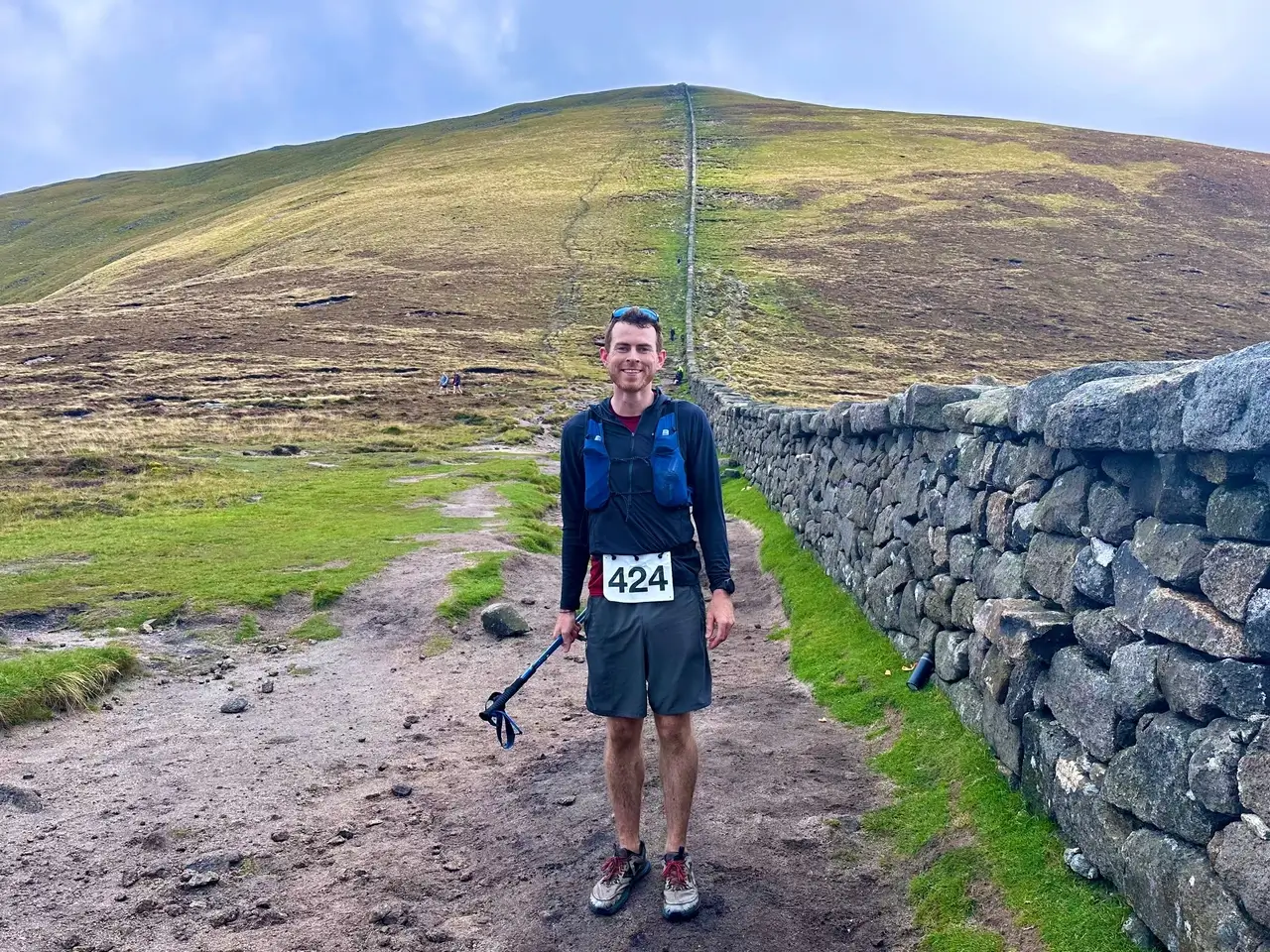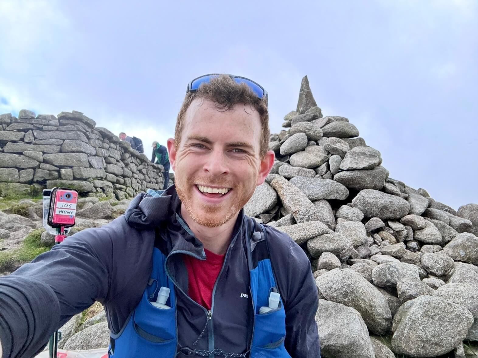 My knee felt much better now and I was able to run the descent where the terrain allowed. The Mourne Wall led once again up a climb to peak seven; Slieve Bearnagh (791m). I did some extra scrambling trying to find the summit in the fog, but after realising it was way more straightforward than I thought, I was scanned in and jogging back towards the finish. The section from here back to the first saddle was particularly beautiful, and had great footing with a slight downhill most the way. Once I got onto the saddle I asked someone to take a photo of me with Slieve Donard behind, and felt so excited to have no more climbing left.