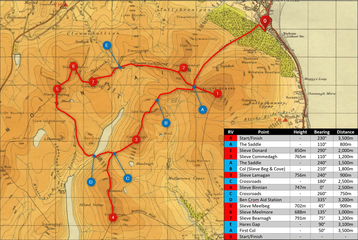 This is my experience of completing the trail run in August 2023. My route card below is specific to the peak order for that year, with bearings and distances so I could still navigate with no visibility. The race starts and ends at sea level in the town of Newcastle, and this year followed a clockwise direction that began with the big one; Slieve Donard.
