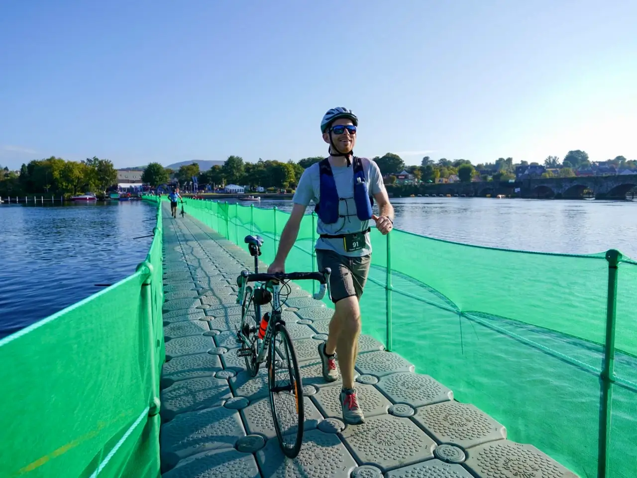 Next was a 26km cycle, following the eastern coast of the lake. It had some surprisingly big climbs on the way, which I kept a fast pace through. I looked across the water to Moylussa; Clare’s highest mountain and the biggest challenge we’d face later today. This cycle was a lovely section, though it did drag on so I chatted to others to pass the time. The coastal road brought us back into Killaloe where we were diverted to the new floating bridge. I dismounted and ran across while being cheered on by hundreds of supporters. This bridge was very cool.