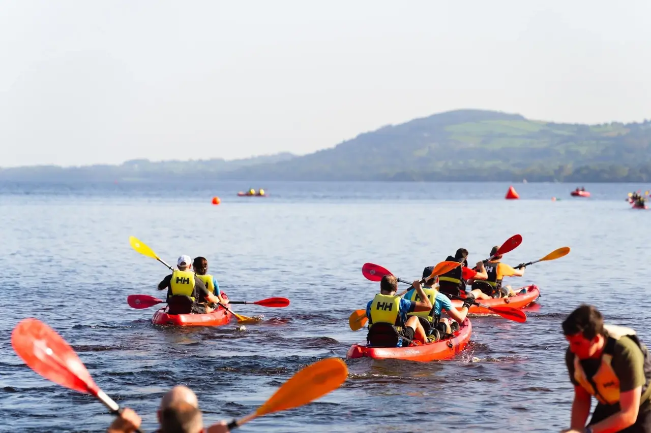 On the western side of the lake, we ran (strangely far) with our bikes before being allowed back on. The weather was ridiculously nice, cooking us for the next 10km cycle as we looped around the country roads below Moylussa. A shorter section, but with hills that made it no less torturous. I was so happy to rack the bike in the next transition, knowing that all cycling was essentially done. The short 1km kayak loop was next, made extra fun as my friends were helping with gear and safety for it. A short loop, maybe 5mins, returning with a view of Moylussa above.
