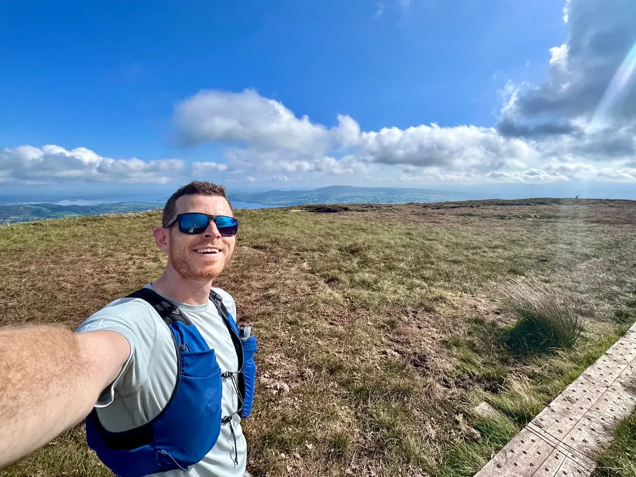 In the transition area I ate a protein bar and drank some extra water before this last stage; a 12km trail run to the summit of Moylussa and back. I took it tactically, with a fast paced hike all the way up. Short bursts of running helped me overtake a lot of people, then back to fast hiking to keep my heart rate low. The steep sections near the top are brutal at the best of times, but I was soon crossing the boardwalk to the peak. I could see Millenium Cross in the distance and it looked tiny. It also seemed like a distant memory being up there that morning. It always amazes me how much you pack into a day at these events.