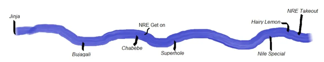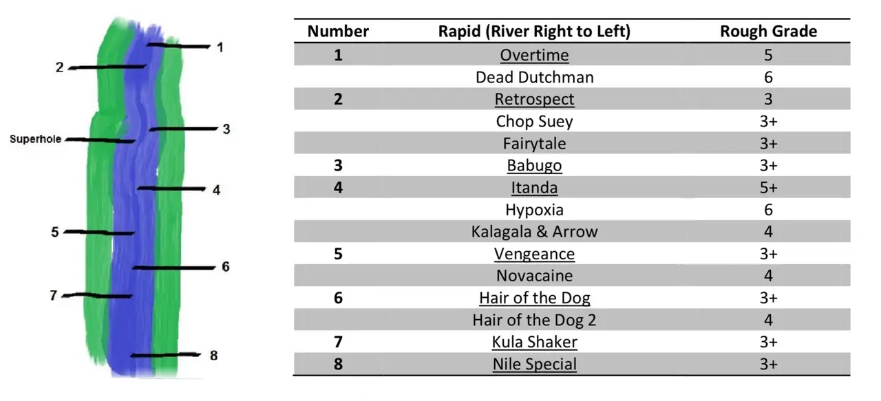 - The underlined rapids are the easiest route down and are generally what the rafts will do (although they walk half of Itanda always and will walk the top of Overtime if it’s high).