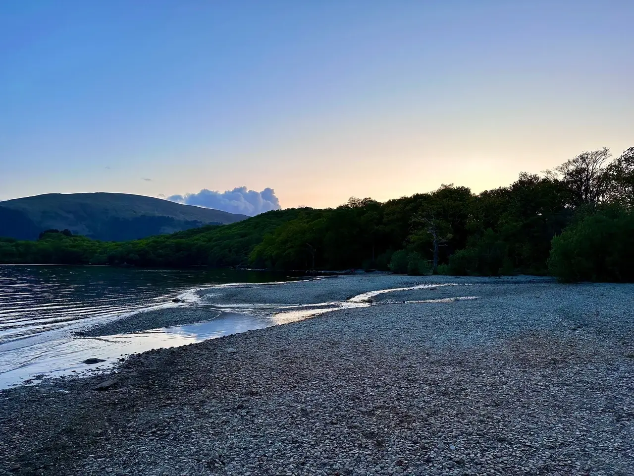 There was every sort of terrain today and I particularly loved the stone steps. They led all the way to the lake, which was then a meandering forest trail over gravel and tree roots. Scenic points with statues and benches looked out on islands, and surprisingly quickly I reached my campsite. Loch Lomond National Park is the only place where wild camping is by permit only so I chose the paid campsite to keep it easy. I arrived a bit early again, setting up my tent at 12:30am, but it gave me time to charge my batteries and relax by the beach.