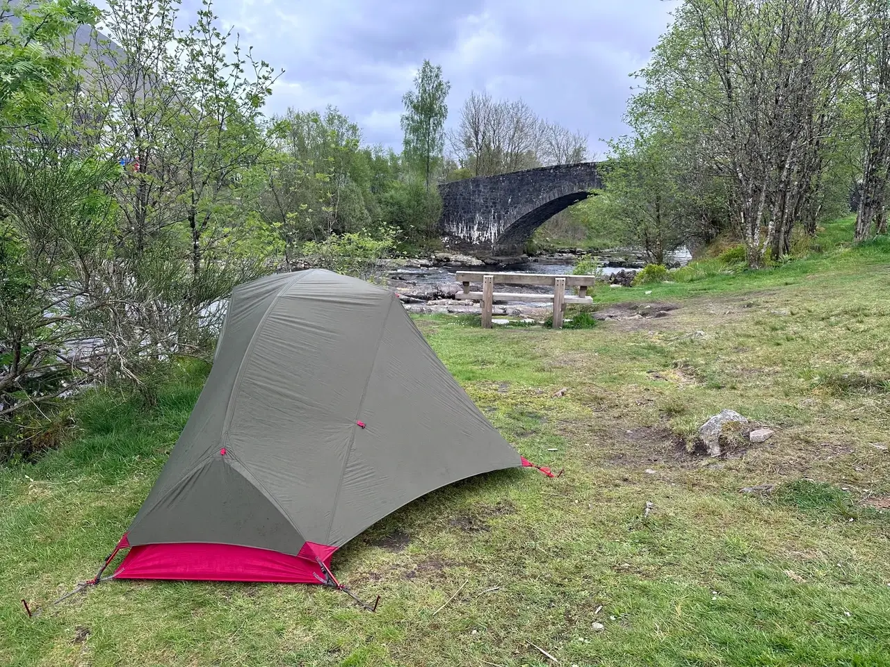 Around 3:00pm I reached Bridge of Orchy, setting up my tent beside the low river. It was here the midge made their first appearance and hurried me into the hotel for dinner and drinks. I got chatting to a few hikers who were taking the luxury approach of hotels all the way, and everyone seemed to love the trail so far. The burger and cheesecake were great and ensured I slept soundly that night, listening to the flowing rapids beside me. I had been admiring the old photos of kayakers on the Orchy in the hotel, and thought back on my own kayaking memories in Scotland and these valleys that night.