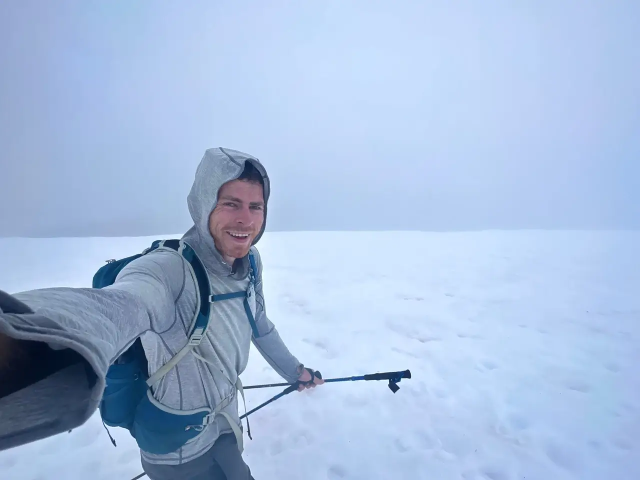 The way down was the fastest trail run I’ve ever done, having earned every bit of it through the climb. I skiied where I could, stopping once to empty the snow from my shoes, and descended below the clouds to reveal the lake and views from earlier. I was flat out and loving it, with big stone steps making easy and stable targets for the unfolding puzzle ahead, and my poles stabilising me all the way.
