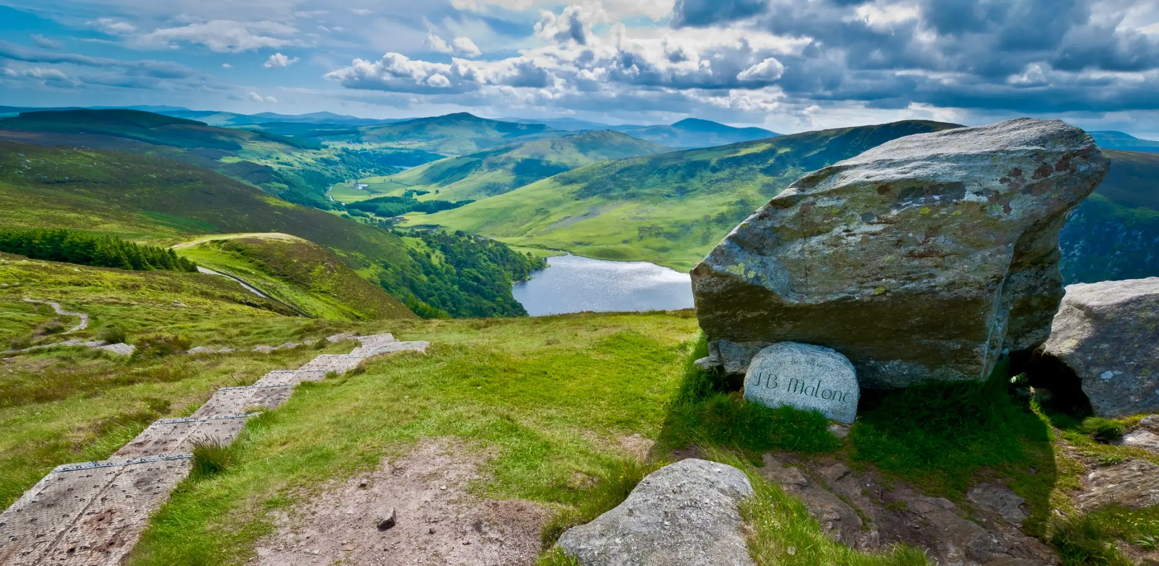 As head of the National Trails Committee, he negotiated rights of way with land-owners to make The Wicklow Way a reality. Opened in 1977, it was a historic first for the country. A memorial to J.B. Malone, who died in 1989, was erected on the Wicklow Way near Lough Tay. The now 42 national waymarked trails, including the Kerry Way and Dingle Way, are directly attributable to this one man.